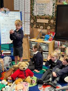 We have had an exciting couple of weeks in Class 1 after we came in one morning to find some bear footprints in our classroom. After sharing the story we decided we needed to go on a bear hunt to see if we could find the bear. As part of our Literacy learning we wrote a list of what we would need to bring and packed a rucksack. We learnt the story, made up our own actions to go with it and retold the story in the role-play area with masks or in the small world tray with puppets. We also found out why the bear might like to hide in a cave and why they hibernate. The children had great fun making their own little bear caves. At the end of the unit the children went on a bear hunt in the forest school area, negotiating their way through the long grass, river, forest, snowstorm until finally they found the bear hiding in the cave!