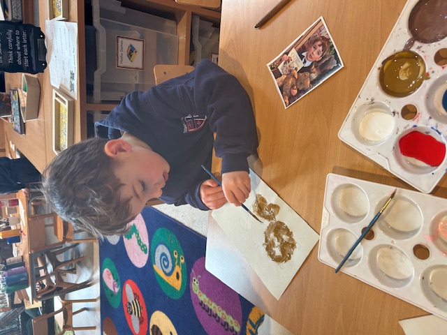 We have had an exciting couple of weeks in Class 1 after we came in one morning to find some bear footprints in our classroom. After sharing the story we decided we needed to go on a bear hunt to see if we could find the bear. As part of our Literacy learning we wrote a list of what we would need to bring and packed a rucksack. We learnt the story, made up our own actions to go with it and retold the story in the role-play area with masks or in the small world tray with puppets. We also found out why the bear might like to hide in a cave and why they hibernate. The children had great fun making their own little bear caves. At the end of the unit the children went on a bear hunt in the forest school area, negotiating their way through the long grass, river, forest, snowstorm until finally they found the bear hiding in the cave!