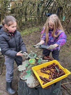 Reception are enjoying their first forest school session. They made a very cool 😎 Conker run. They also decorated conkers to make into necklaces and explored the mud kitchens. To kick the session off we enjoyed an autumnal story together.