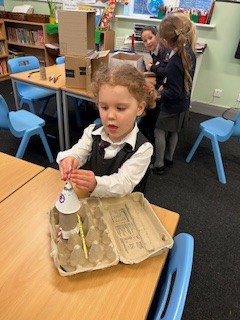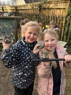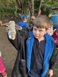 It has been a little bit wet recently but this did not dampen our spirits. The children all got wrapped up and embraced the mud! Reception have been looking at 'toys' as their topic this term. We chatted around base camp about how children played outside many years ago, with no plastic toys in sight. We made some conker targets, a conker run, our own take on skittles and stepping stones. It was great fun!